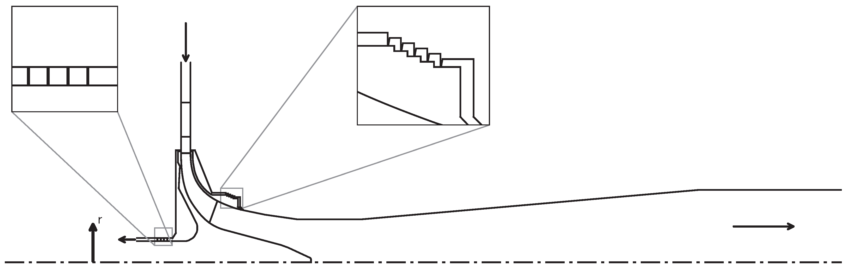 The investigated radial turbine is a prototype developed by Everllence SE (see [] for a discussion on the design of this device). It was designed to investigate the operating behavior of the turbine stage in an air-breathing test rig, which is currently under construction. The turbine features a covered low-specific-speed rotor with 19 blades and a stator consisting of two components: a volute and a nozzle ring with 17 vanes. As the stage under investigation is an early prototype, the volute is currently still under development and not yet available to be included in the study. A meridional view of the whole machine is shown in Figure 8, where a zoomed-in view highlights the labyrinth seals.
