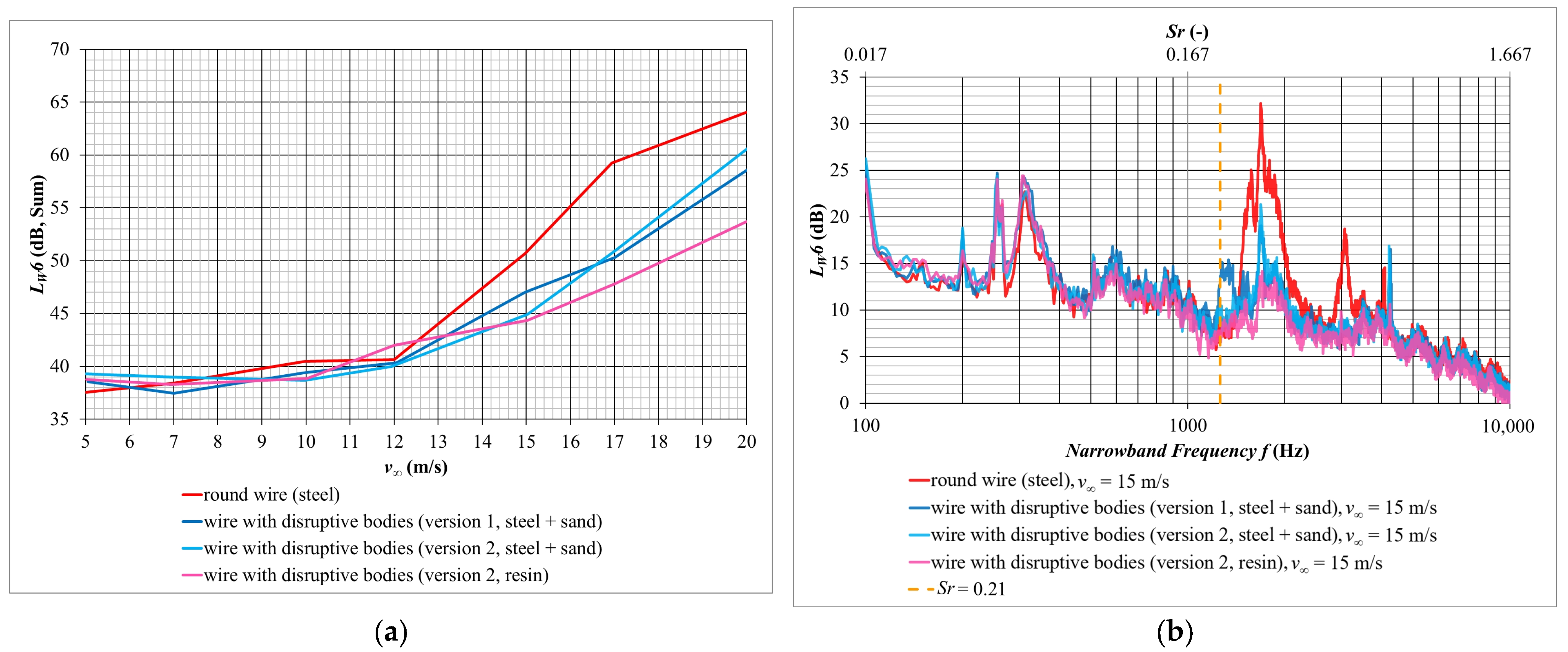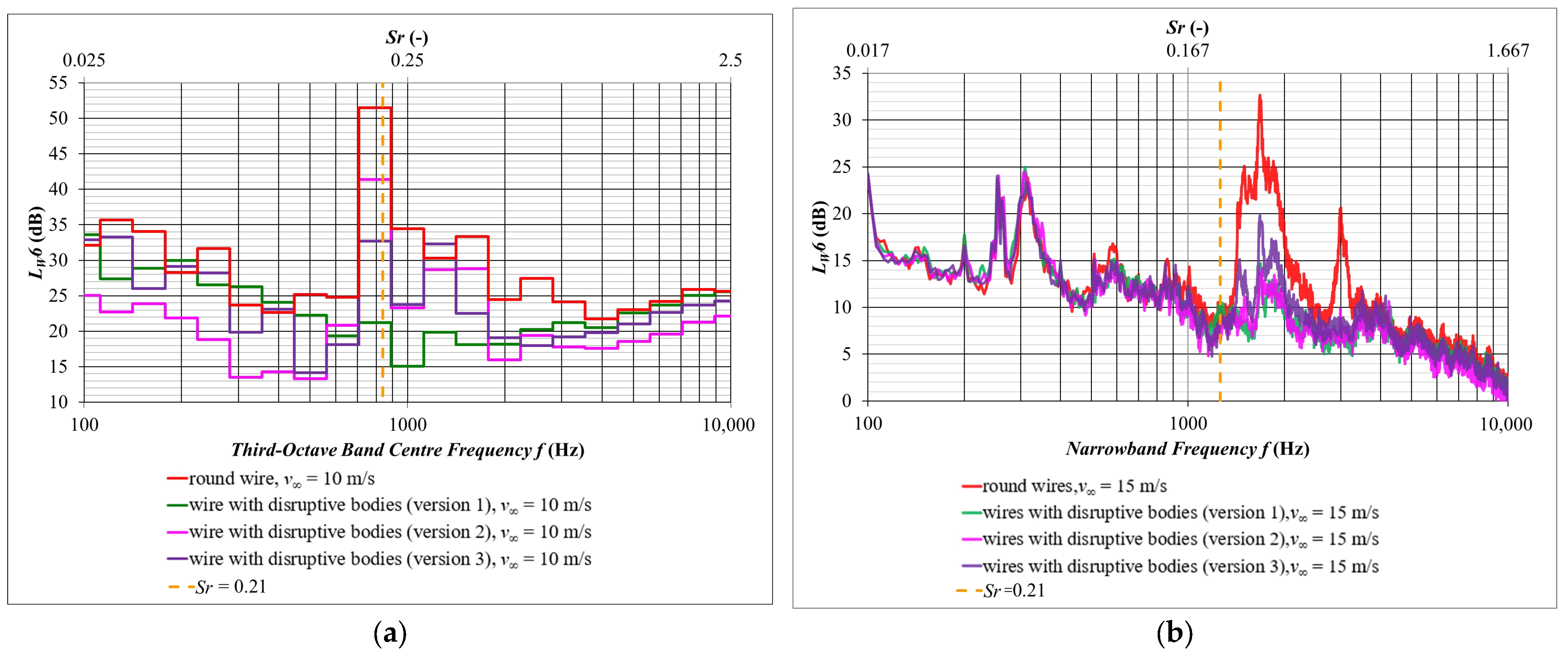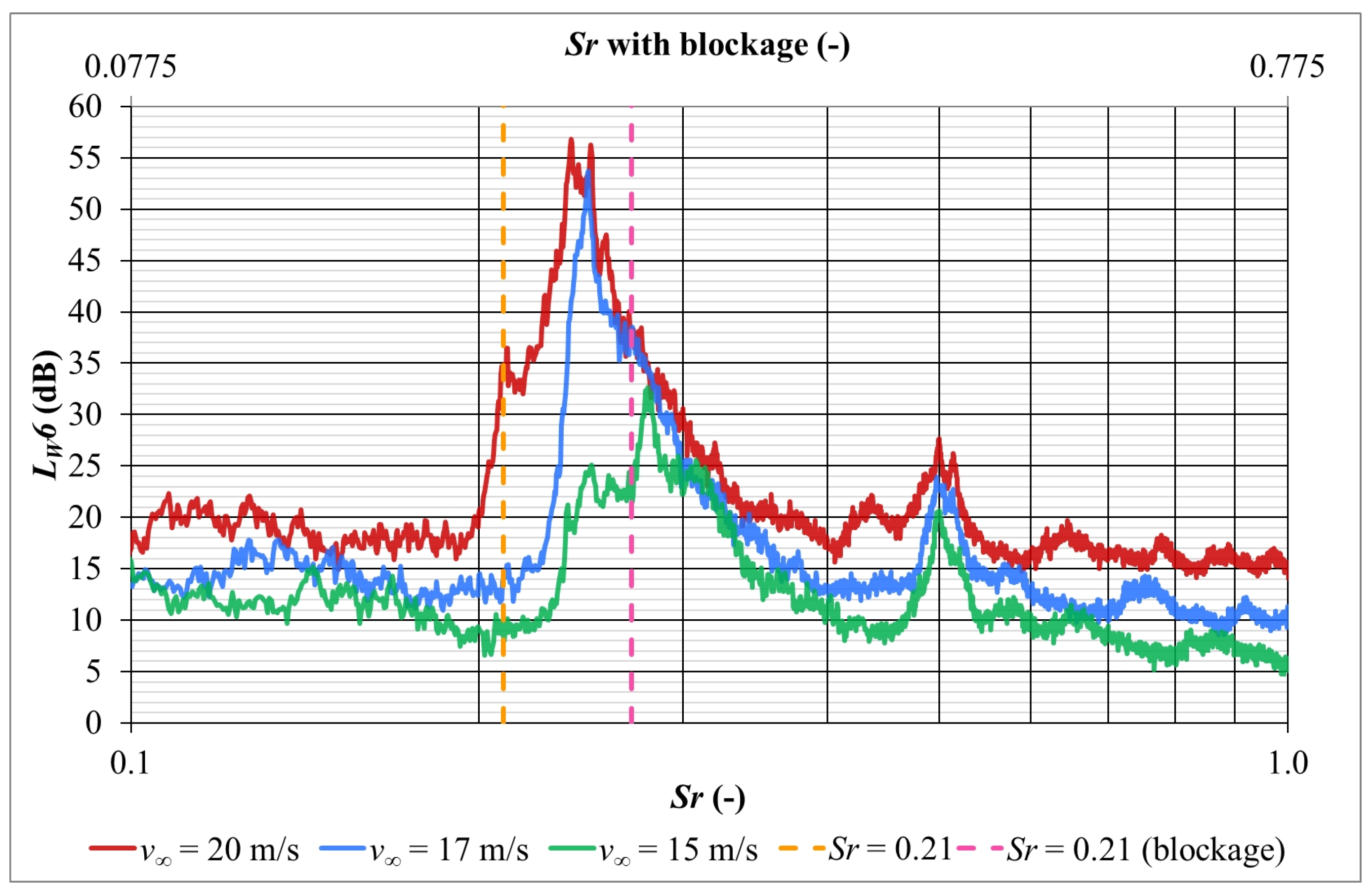 | v∞ (m/s) | ftheo (Hz) (Sr = 0.21) | ftheo,9wires (Hz) (Sr = 0.21) | fexp (Hz) Narrow Band | fsim (Hz) Third-Octave Band |
