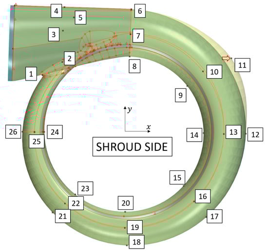 Figure 2. Parametrization of volute geometry with 26 points or 78 degrees of freedom, respectively.