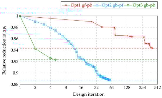 The parameter- and gradient-based approach (Opt3 gb-pb) is quite successful at first; however, it stalls after five iterations at a result that is still remarkably better than design 403 of Opt1 gf-pb, even though both algorithms share the same design space and parametrization, respectively. Why the algorithm stalls so soon is difficult to answer. We propose two hypotheses: (1) The algorithm may have hit a local or the global minimum. If this were true, however, one would expect Δ p t p i , j 0 , which is not the case, though. The derivative is reduced by only about one order of magnitude compared to the baseline design. (2) Hence, we deem it more likely that the derivative approximation is not precise enough for further improvements. This is not studied any further within this paper. Instead, we focus on the improvements the algorithms gained and aim to understand where they come from.