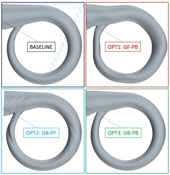 In Figure 6 the baseline as well as the three optimized volutes are shown side-by-side. In the next section particular attention is paid to Opt2 gb-pf and Opt3 gb-pb. In contrast, the result from Opt1 gf-pb is not discussed any further, as the results were too poor compared to the other two.