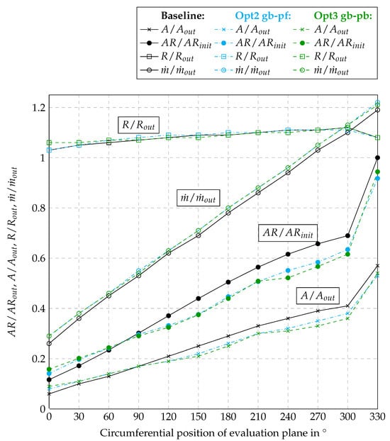 Figure 10. Area-to-radius ratio A R / A R i n i t , area A / A o u t , radius R / R o u t and mass flow m ˙ / m ˙ o u t versus circumferential position.