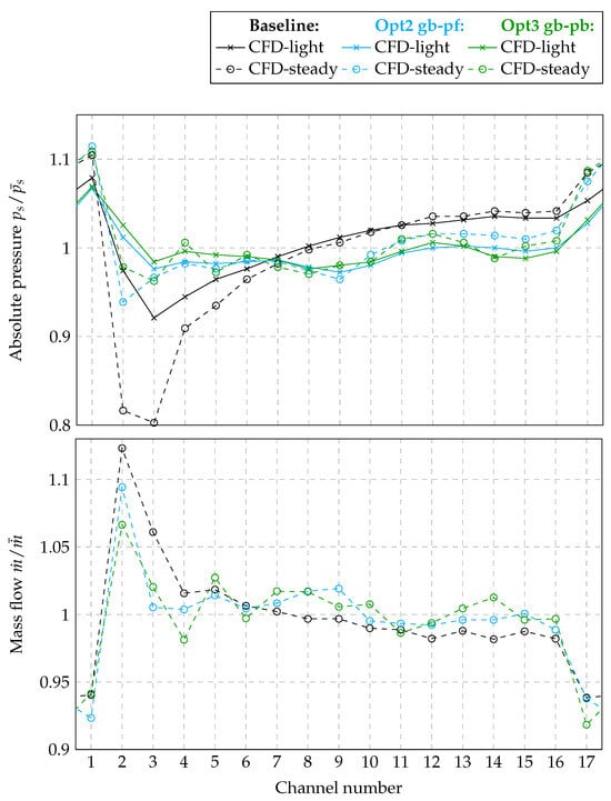 We better understand this behavior by looking at the pressure distribution. For this purpose, we once more use the numbering of the channels from 1 to 17, which was previously introduced. Within each channel, we evaluate the static pressure before and after optimization at the cross sections highlighted by the white arrows in Figure 11. We do this evaluation for CFD-light and CFD-steady to highlight that these findings are not particular to a certain setup. We study both the mass flow m ˙ through each channel as well as the static pressure. The data are summarized in Figure 12.