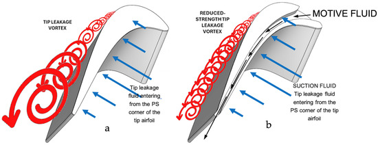 (a) Untreated baseline AFTRF airfoil with flat tip. (b) Implementation of the fluid dynamic ejector on the tip platform for attracting the tip leakage fluid.