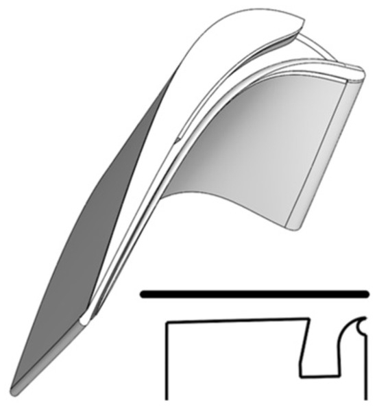 Eleven ejector-based blade tip concepts are designed and analyzed. The new designs are computationally studied in the Axial Flow Turbine Research Facility (AFTRF) at the Pennsylvania State University. The AFTRF is a single-stage, large-scale, rotating turbine test rig designed with similar loading characteristics to the E3 engine design from NASA/GE [43]. The basic geometry of the turbine blades in the facility is presented in Figure 3. The manufacturing coordinates of the tip section of the rotor airfoil are presented in Appendix A. The eleven ejector-based tip leakage mitigator designs are shown in Figure 4, Figure 5, Figure 6, Figure 7, Figure 8, Figure 9, Figure 10, Figure 11, Figure 12, Figure 13, Figure 14 and Figure 15. This selection of concepts is based on critical junctures in the design evolution, which employ key geometric changes to the turbine blade that are computationally predicted to produce measurable aerodynamic improvements. A cross-section normal to the blade tip platform, at 55% axial chord, is also presented in each design. A tip gap of t/h = 0.8% is used for the baseline geometry and the eleven new leakage mitigator designs