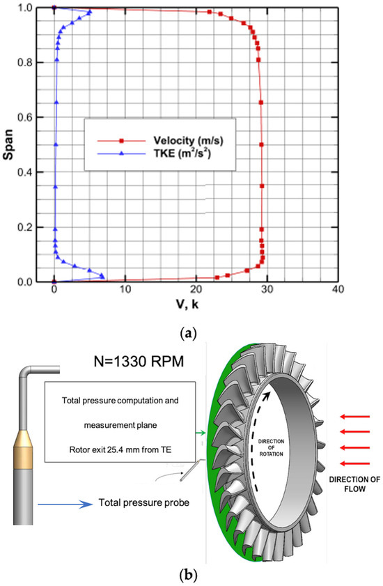 (a) Measured velocity and turbulent kinetic energy profile of AFTRF at the NGV inlet [29]. (b) Stage exit total pressure probe and its positioning at the rotor exit in the stationary frame of the AFTRF.