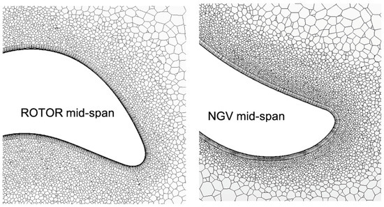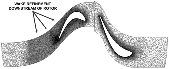 The computational domain: Figure 18 shows the computational domain for the AFTRF stage constructed based on the high-resolution coordinate scans of the AFTRF stage components. The stage computational domain consists of the NGV fluid domain and rotor separated by a mixing plane. The finite volume mesh for the AFTRF fluid domain is constructed using 3.5 million arbitrary polyhedral cells and the flow features close to the solid boundaries, are shown in Figure 19. Thinner, prism-shaped cells are used near all solid boundaries to increase the accuracy of the flow features in viscous sublayers. In addition, 9 million cells are used for the NGV fluid domain and the rotor flow field, respectively, totaling 12.5 million cells for the entire fluid domain. Mesh refinement is used for the rotor, and the NGV blade surfaces. The refinement around the rotor blade to improve the accuracy of the vortex-occupied regions are presented in Figure 20. Standard wall functions in STAR-CCM+ were employed for the wall treatment. Convergence was assessed using STAR-CCM+’s normalized residuals, in which each residual is scaled relative to the maximum value recorded during the initial iterations. The default stopping criteria were applied, requiring normalized residuals for continuity, momentum, and turbulence equations to fall to approximately 10−5. In addition, the global mass flow balance between the inlet and outlet of the rotor stage was monitored as a supplementary check on convergence stability. The balance was always kept within ±0.001 kg/s.