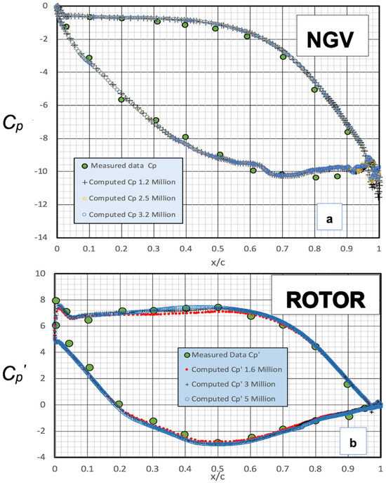 Grid dependency is evaluated by extracting computed static pressure on the NGV and rotor blade mid-spans. NGV blade pressure data is extracted using 1.2 million, 2.5 million, and 3.2 million cells. Rotor blade pressure data is also extracted using 1.6 million, 3 million, and 5 million cells. The grid dependency range presented in Figure 22 was also extended up to 4 million and 9 million cells for the NGV and rotor, respectively, with no significant change from the results. The results in Figure 22 demonstrate a negligible grid dependency of the static pressure in these cell count ranges. The measured mid-span static pressure coefficients in the AFTRF turbine stage obtained by [48,50] compare well to the current computations, proving the value of the present computational approach in turbine tip mitigation design and further assessment.