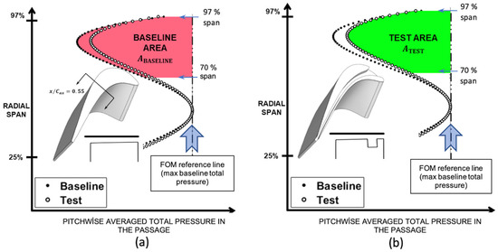 The non-dimensional FOM for each design is obtained by differentiating the ‘ABASELINE’ and ‘ATEST’ data areas shown in Figure 23. The lower span limit of the two areas is located at 70% span to observe the local flow modifications because of the ‘altered’ tip vortex and ‘relocated’ upper passage vortex in the turbine passage. The new tip mitigator designs usually reduce the tip leakage mass flow rate and strength. The weakened tip vortex structure of the new design also reduces the level of strong interactions with the counter-rotating upper passage vortex, causing distinct total pressure field variations in the last 30 percent of the blade height. These areas are typically calculated using a numerical integration technique between 70% and 97% span.