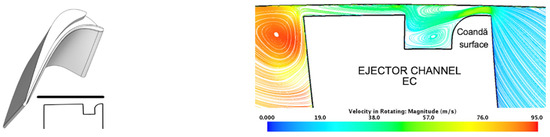 Ejector Coandă (EC): The Ejector Coandă (EC) concept is presented in Figure 5. This design features a rounding of the near-PS channel wall of the Ejector Baseline (EB), creating a strongly convex Coandă surface. The Coandă effect is the tendency of a fluid stream to stay attached to a surface of any form to entrain fluid from the surroundings so that a region of lower pressure develops. It is named after Henri Coandă, who was the first to recognize the practical application of the phenomenon in aircraft design [44]. Adding a well-rounded convex surface improves the entrainment of the tip leakage fluid into the ejector channel [45]. This Coandă surface has an initial radius of 3 mm at the LE of the blade, which linearly diminishes to 0 mm as the channel wall runs down the axial chord of the blade.
