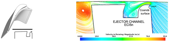 The Ejector Coandă-I (ECI): The Ejector Coandă-I (ECI) concept presented in Figure 6 is identical to the Ejector Coandă (EC) design except that a 1 mm linear incline is placed on the near-SS ejector channel wall, which terminates at about 60% of the blade axial chord.