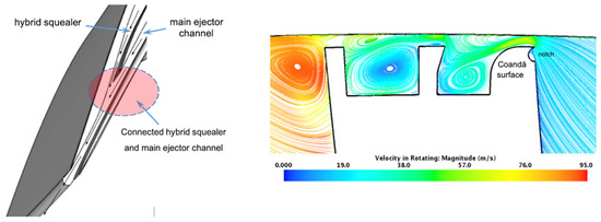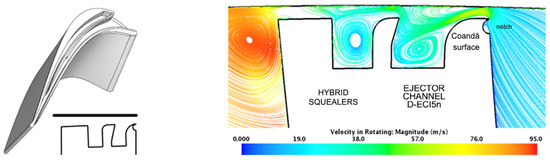 Design geometries: The streamlines in the tip region of the blade on a plane section, positioned at x/Cax = 0.3, oriented normal to the blade camber generated from the computations of all ejector-based concepts are presented in Figure 25, Figure 26, Figure 27, Figure 28, Figure 29, Figure 30, Figure 31, Figure 32, Figure 33, Figure 34, Figure 35 and Figure 36. The streamlines are color-coded with relative velocity magnitude.