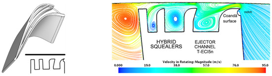 The Ejector Coandă-I5n Hybrid Ejection Squealer (ECI5n-HES): The Ejector Coandă-I5n Hybrid Ejection Squealer (ECI5n-HES) concept is shown in Figure 10. The TE end of the hybrid squealer cavity in the Ejector Coandă-I5n Hybrid Squealer (ECI5n-HS) is opened to a thin passage that connects the cavity of the hybrid squealer to the main ejector channel. An enlarged view of the thin passage connecting the hybrid squealer and the main ejector channel is presented in Figure 15.