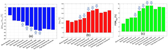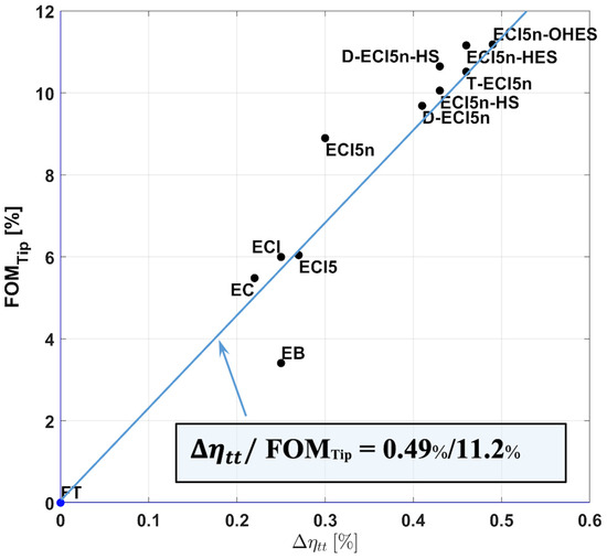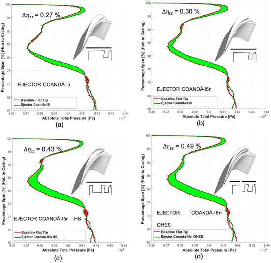 Predictions from an AFTRF turbine blade with a flat tip gap of 0.80% are used as a baseline in all predictions. This tip clearance value remains unchanged for all new design cases with a tip leakage mitigator. Three baseline metrics of comparison are generated from these computations: the baseline passage-averaged total pressure-based figure of merit FOMTip at the rotor exit, the baseline total-to-total stage isentropic efficiency, and the baseline rate of leakage mass flow through the clearance gap. The values of these three parameters provide the benchmark against which alternative designs are compared. The computations for the baseline flat tip (FT) predict a tip-gap mass flow rate of 8.38 g/s and a total-to-total isentropic efficiency of 89.44%. Streamlines in the tip region of the blade on a vertical plane section positioned at x/Cax = 0.3 are presented in Figure 24a. This plane, vertical to the flat tip, is also normal to the camberline of the tip airfoil. The spanwise distribution of circumferentially averaged total pressure data for a single passage is presented in Figure 24b. The total pressure deficit due to the presence of the tip leakage vortex is seen between the 70% and 95% spans. This spanwise interval also carries the upper passage vortex-related aerodynamic losses. The circumferentially averaged reference data set in Figure 24 serves as the reference level for each new tip mitigator design. The total pressure-based tip figure of merit, FOMTip, is generated based on the difference between the passage-averaged data of the baseline and that of the test cases as defined in Equation (8) and Figure 23.