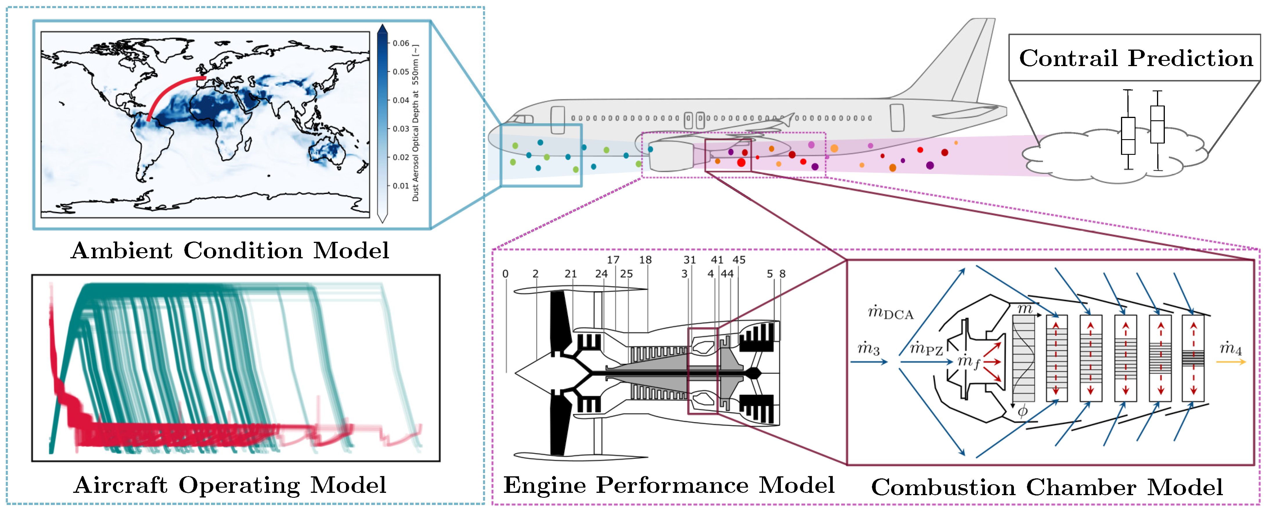 For determining the aero engine performance, simulating the combustion processes and subsequently predicting contrail formation, the ambient operating conditions are of interest. Specifically, to model the interactions between engine exhaust and ambient conditions, potentially resulting in the formation of contrails, an ambient condition model provides inputs on boundary conditions. This model contains, among other data, the outputs from atmospheric composition and meteorological models representing the composition and state of the operating environment of an aircraft [