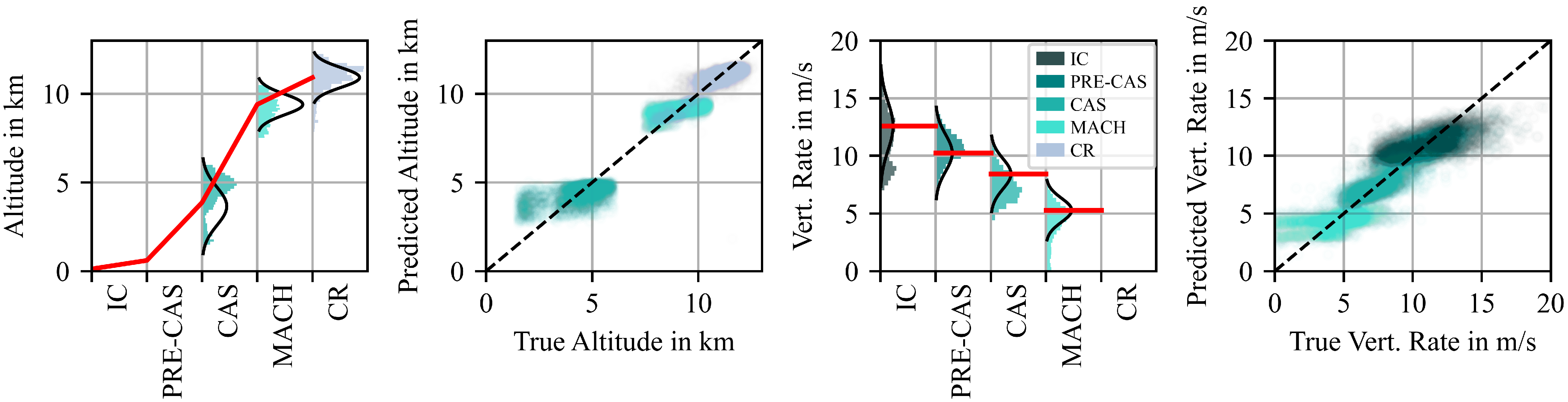 Figure 2 (left from centre, right) shows the corresponding true versus predicted plots of the random forest models. It can be seen that deviations are high at lower altitudes (IC, PRE-CAS), where the parameter distributions are the widest. This is most likely due to ungeneralizable local influences close to the airport, e.g., air traffic management, obstacles, curved flight trajectory, etc. Another uncertainty arises from the unknown true TO weight of the aircraft in ADS-B data. In the presented procedure, weight is correlated with the great circle flight distance. The true value is likely to deviate for individual flights and might be the cause of residual variance seen in the data. Once the climb trajectory is simulated, a cruise phase of constant altitude and Mach number is attached, followed by a default descent and landing profile from the OpenAP base model.