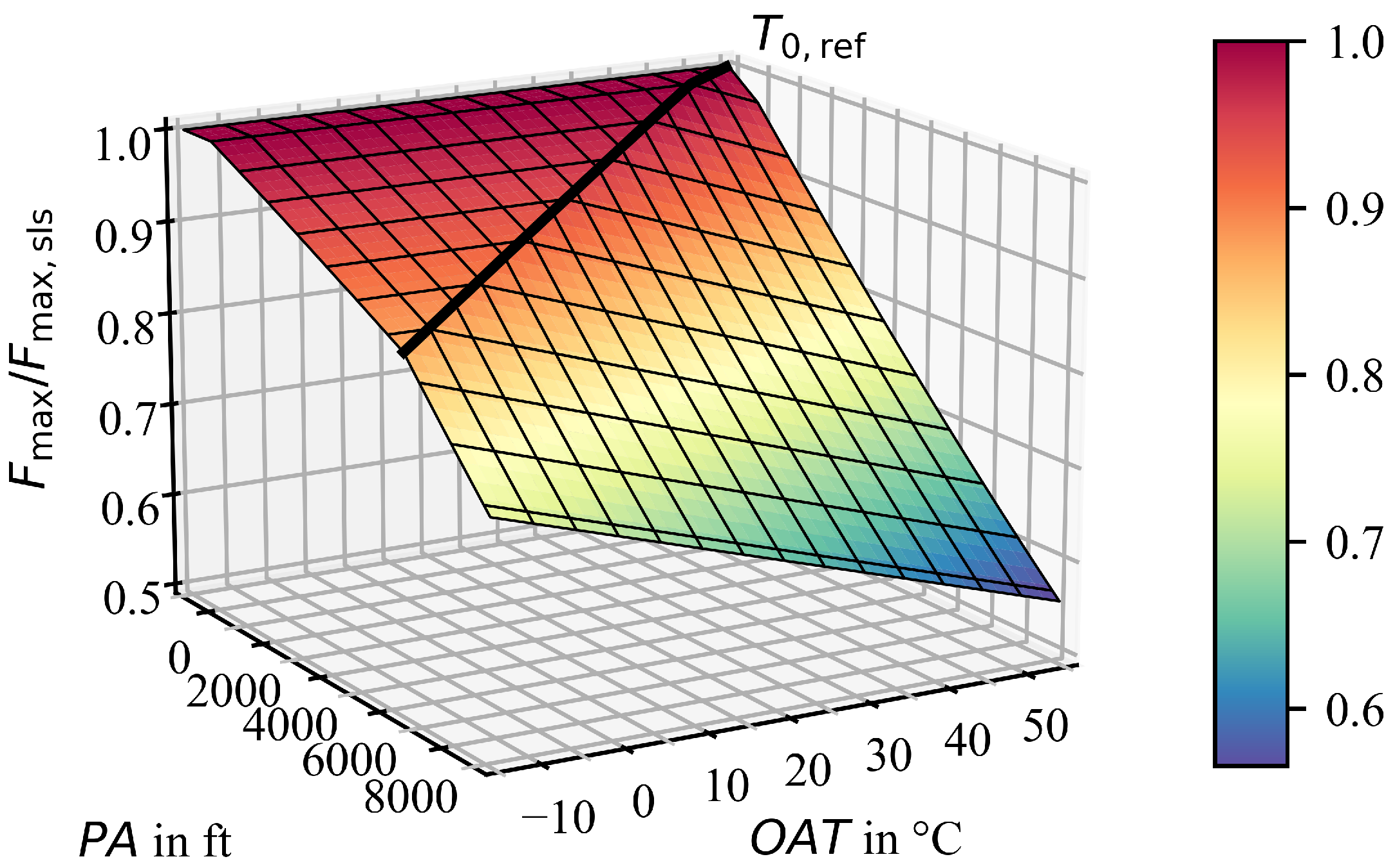 Figure 3 shows the maximum thrust calculated by the model for different PAs and outside air temperatures (OAT). The values are normalized using the maximum thrust at sea level.