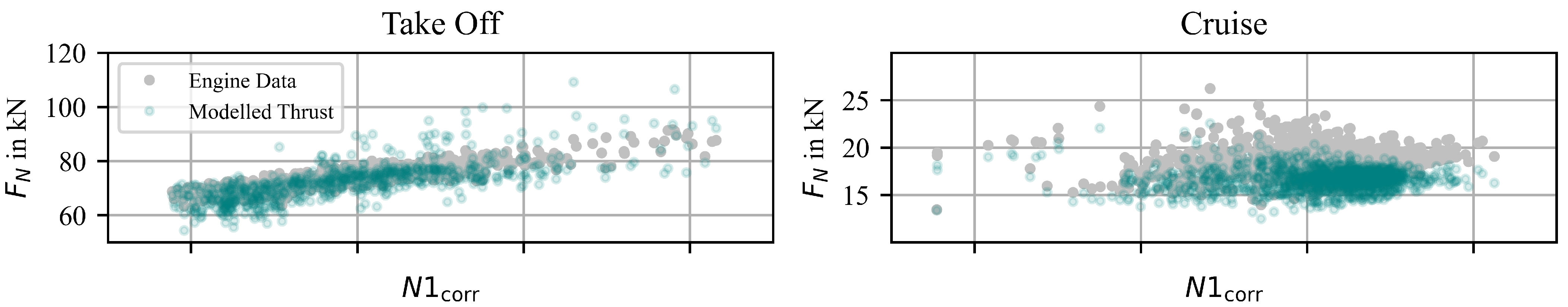 29]. Here, the operating point of the engine is controlled to assure safe and stable operation and to follow a specific flight profile. Because engine thrust itself is not directly measurable within aircraft operation, substitute parameters such as