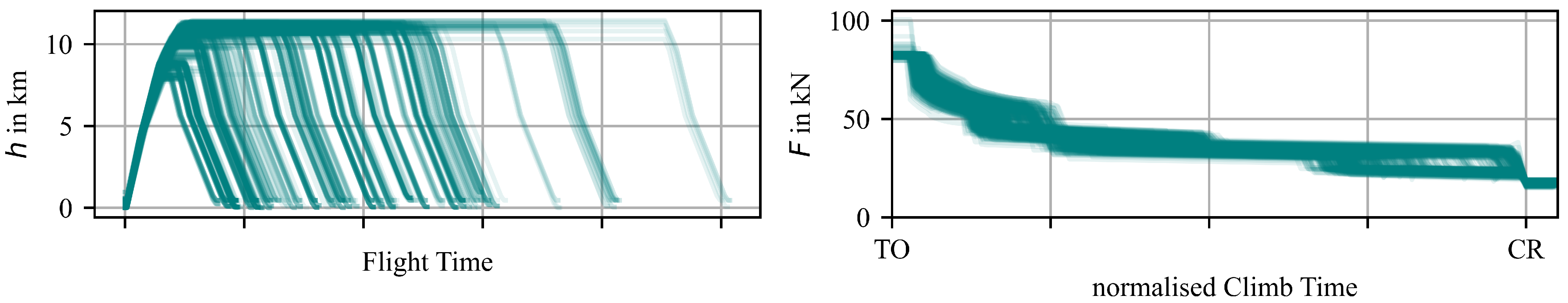 TO and climb are of importance as these flight phases require high thrust settings and have high significance for engine design and operational degradation. At the same time, the characteristics of these flight phases are fairly individual based on mission aspects. In contrast, cruise is a rather steady operating point and descent is performed at low thrust settings close to the lower stability limit of the engine. The model is set up to represent the average behavior of an Airbus A320 aircraft. In contrast to using real kinematic trajectories of existing aircraft from ADS-B data, the model is anticipated to guarantee a high level of flexibility for future investigations considering new aero engine concepts, changes in airframes, and optimized flight profiles by simulation of synthetic trajectories.