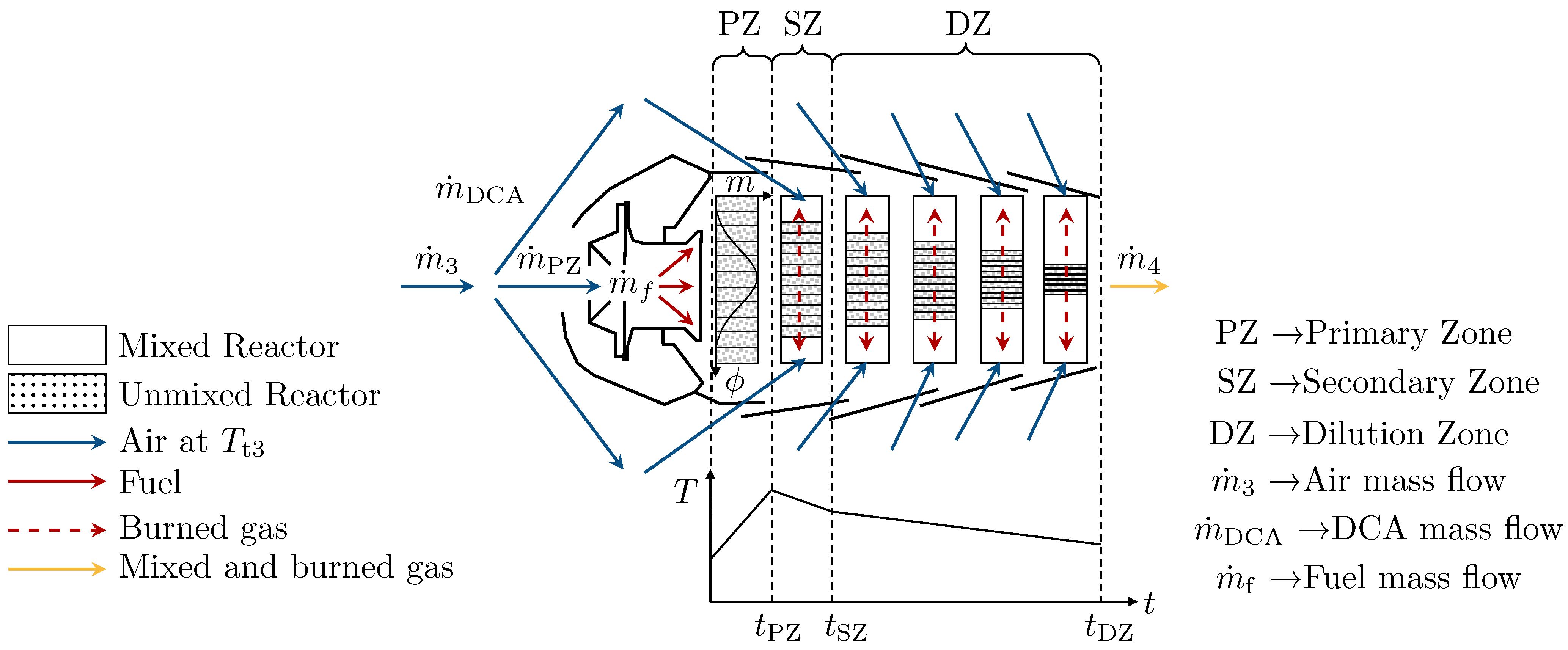 The aero engine performance analysis is conducted using a thermodynamic cycle analysis algorithm for the V2500-A1 turbofan engine. Subsequently, the secondary airflow and fuel flow as well as the compressor outlet pressure and temperature calculated within the performance model are used as input for the CC model. Within the CC model, the combustion processes are simulated in a simplified physics model approach using a CRN [