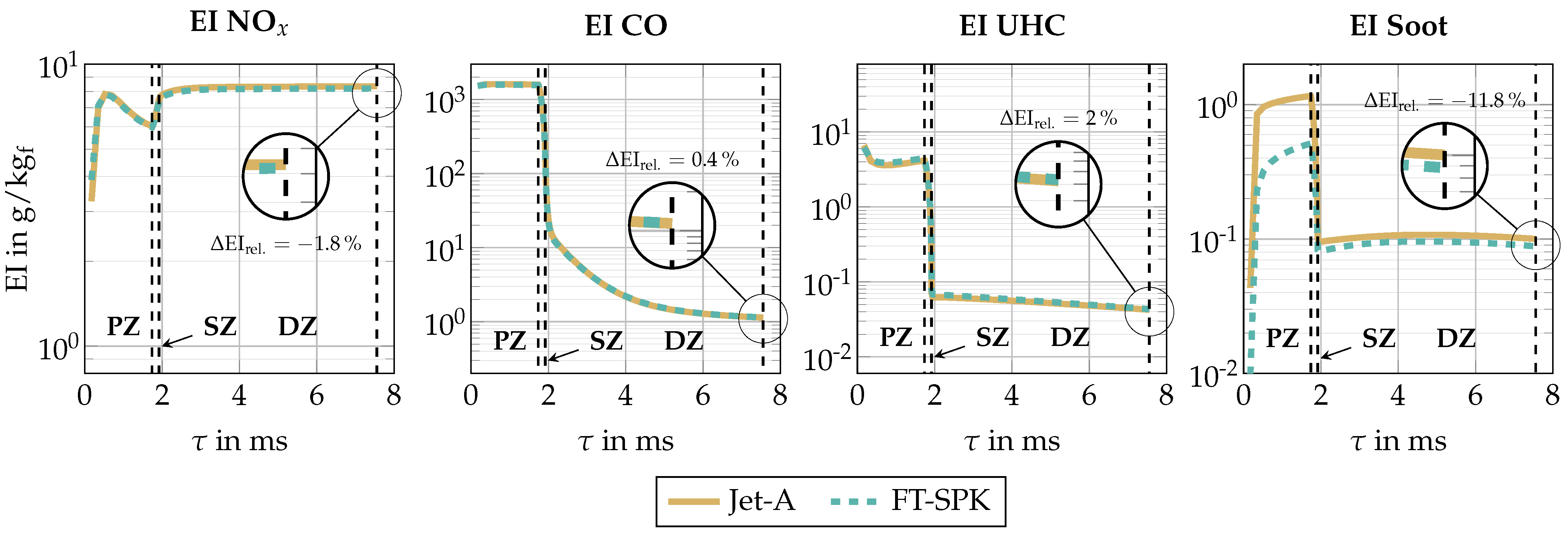 x formation within the SZ. Again, minor deviations between the two surrogate formulations are observed. In the DZ, the remaining mass of DCA is added to the combustion gases, however, with a lower mass flow rate compared to the SZ. Thereby, the oxidation of CO molecules and soot particles is promoted, resulting in a further decrease in EIs. Along the residence time in the DZ, a deviation in UHC and soot formation between the two surrogate formulations is observed. The use of low-aromatic jet fuels such as FT-SPK is reported to result in a decrease in soot emissions. However, it has also been observed that this effect is reduced at high engine power settings [