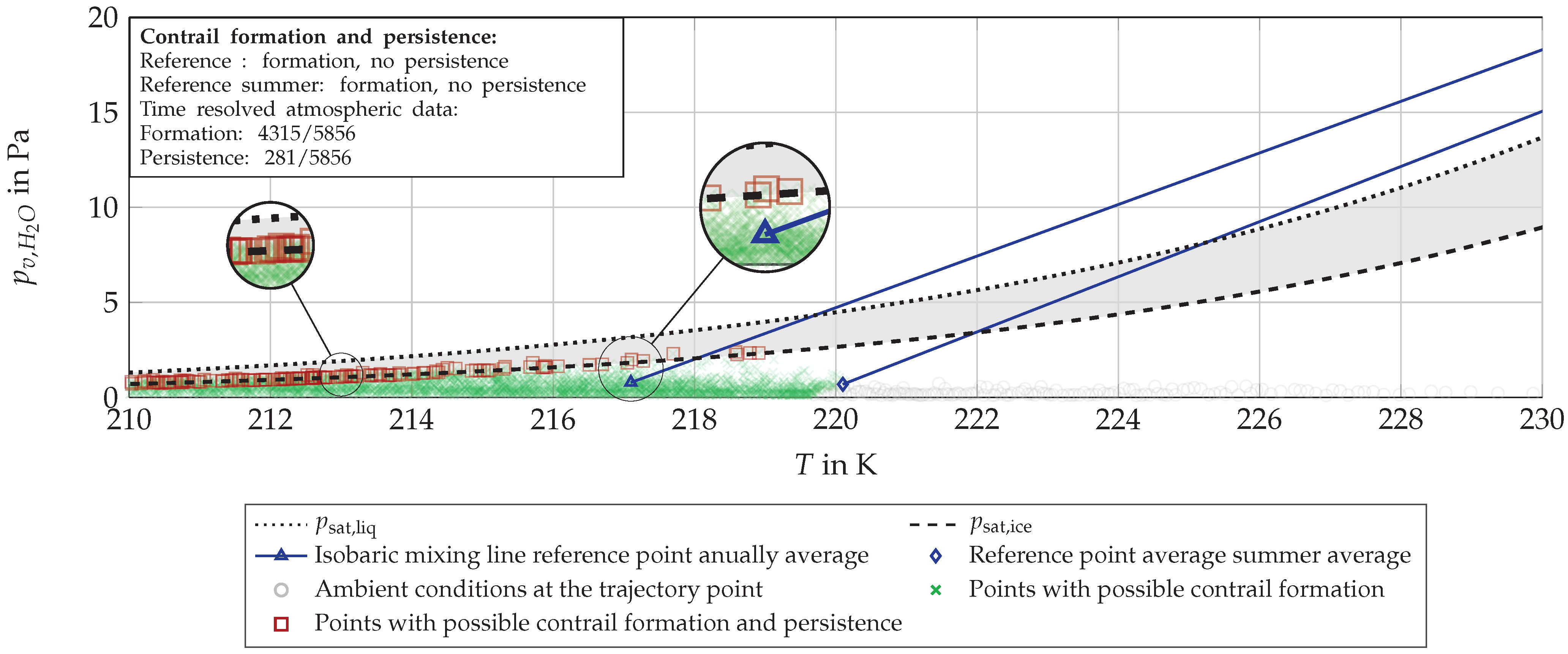 The figure contains ambient conditions from time-averaged and intraday datasets. Here, the intraday ambient conditions over one year are considered. For each set of ambient conditions, the SAC is evaluated, whereby the engine exhaust conditions are assumed to be constant. The SAC can be visualized by connecting the engine exhaust condition and the ambient condition in the partial pressure temperature diagram. When the connecting line tangents the liquid saturation line, contrail formation is possible according to the SAC. If the ambient condition point lies between the ice and liquid saturation lines, the formation of a persistent contrail is possible. Note that the engine exhaust condition is located outside the display area of the figure. For reasons of clarity, only mixing lines for the time-averaged data are shown (blue). Here, the annually averaged ambient condition is marked with a triangle and the summer-averaged ambient condition is marked with a diamond. Note that, in general, mixing lines form between all intraday ambient condition points and the exhaust gas point. The time resolved ambient condition data points are colored and shaped depending on their associated contrail formation predicted by the SAC. The meteorological ambient conditions resulting in contrail formation are shown with green crosses, those resulting in persistent contrail formation are marked using red squares, all other ambient conditions are marked with gray dots. It is observed that both summer averaged and annually averaged ambient conditions result in non-persistent contrail formation according to the SAC. When taking into account the intraday meteorological information with a resolution of 3 h, contrail formation occurs in 74% of the included cases and persistent contrail formation occurs in 5% of the considered cases. This observation underlines the importance of incorporating time resolved atmospheric ambient conditions to represent realistic boundary conditions.