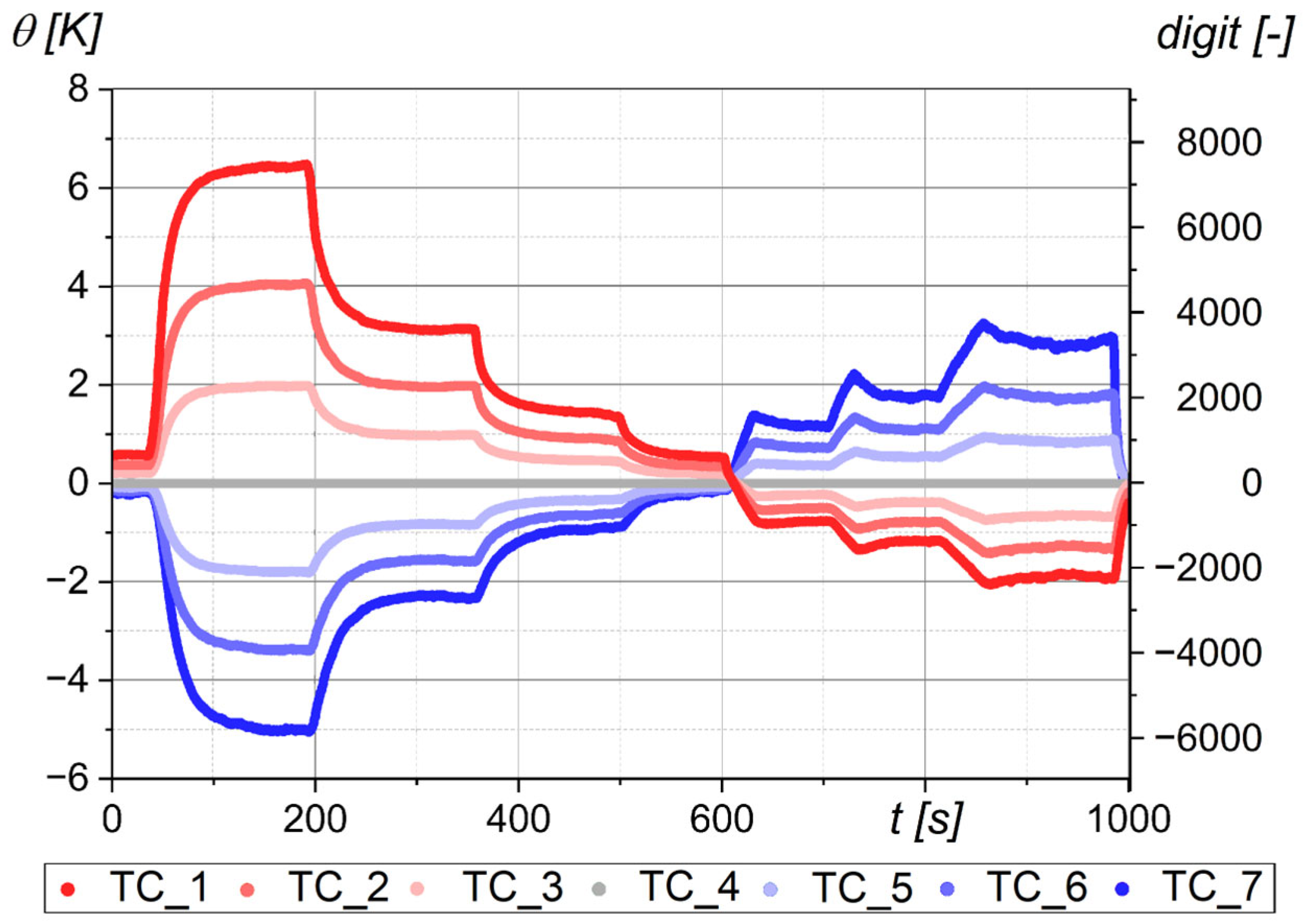 Figure 2 presents the time plot of the differential temperatures relative to the cold junction at the centre. Heat fluxes were applied to each of the rod ends. It can be observed that the heat fluxes across the rod are reversed. Consequently, heat fluxes can be measured validly in both directions. The resolution is comparatively high, exceeding 1000 digit/K for steel and exceeding 600 digit/K for nickel–chrome, with low scattering. The sampling rate was approximately 5 Hz.