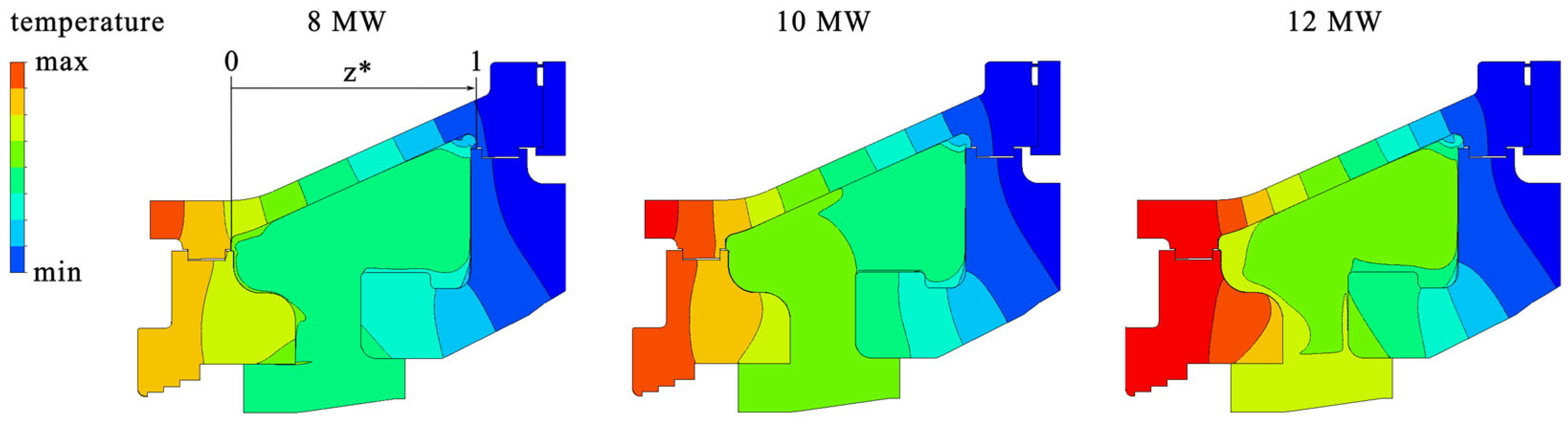 7]. However, the machines are supplied with live steam asymmetrically. Control stages mitigate this effect, but do not completely equalise it. Consequently, hot circulating flow regimes develop, which also heat up the contacting components significantly. This can cause hotter spots and colder spots, meaning transient operation sometimes results in high thermal stresses. These must be investigated to design steam turbine components under high thermal loads in terms of mechanical load and lifetime prediction [
