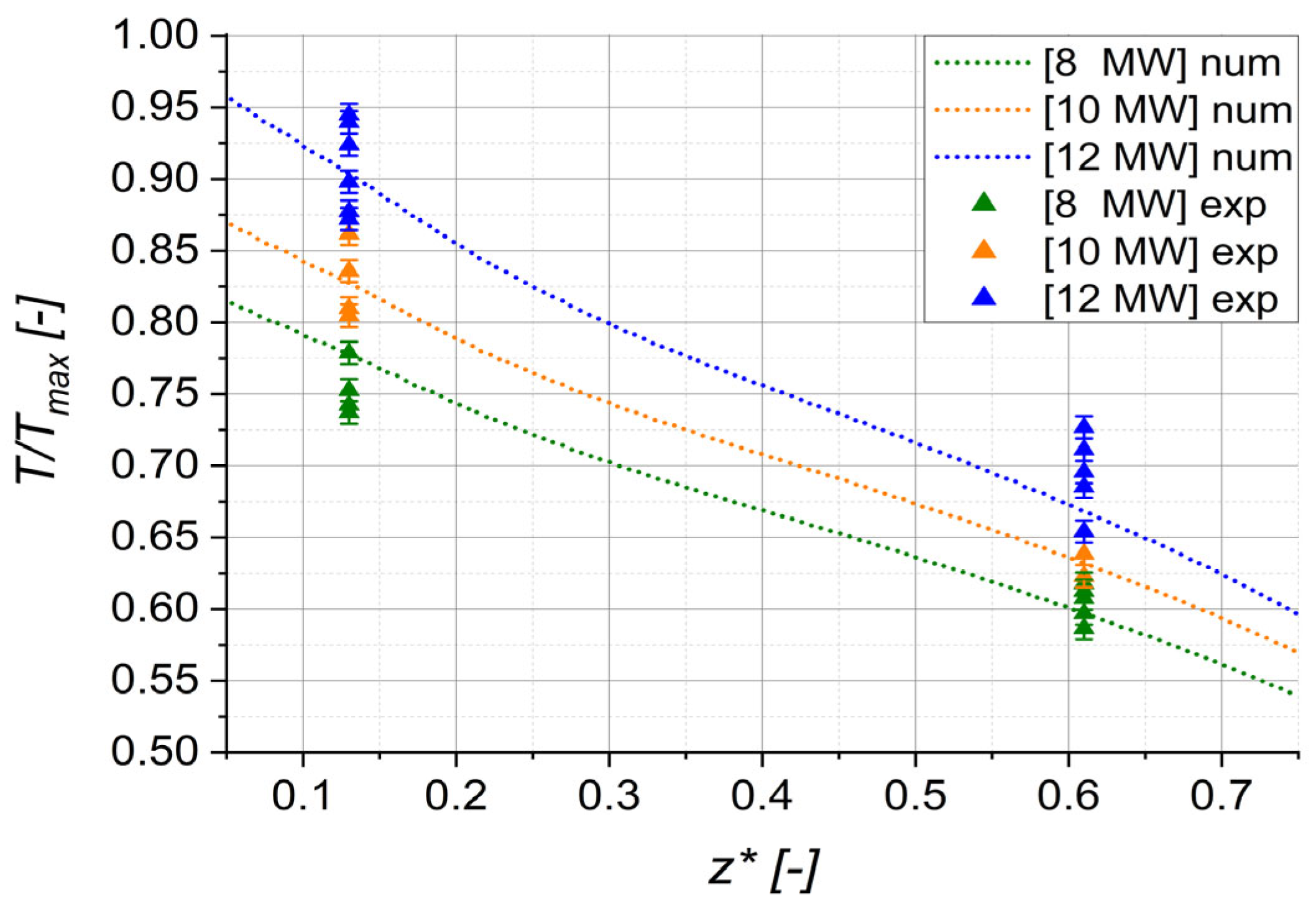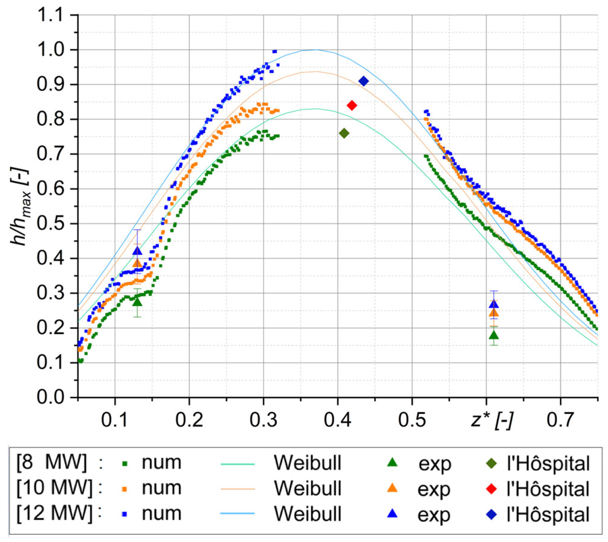 Figure 13. The following colour code is as in the previous diagrams: 8 MW—green, 10 MW—orange, 12 MW—blue. The experimental results are represented by triangles, the numerical calculation by squares, the approximated function based on the numerical calculation as a line, and the results from l’Hôspital as diamonds. The approximated function is similar to a skewed Gaussian distribution. A Weibull distribution was chosen for the approximation. All required fits were approximated using least squares with the programme OriginPro (version 2023b 64-bit SR1).