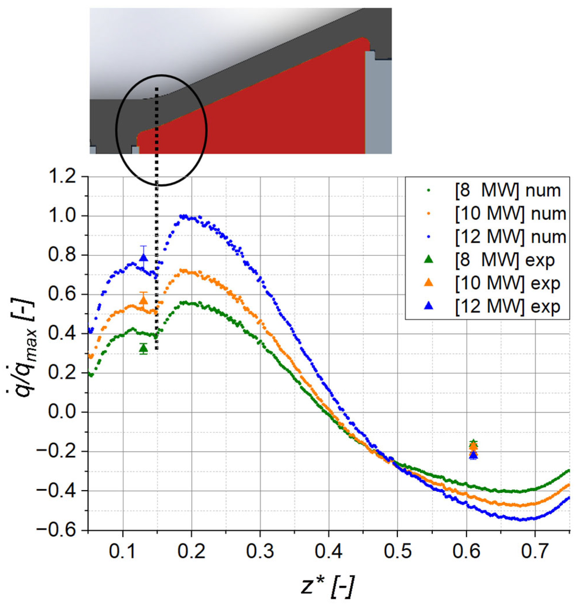 Nevertheless, there is good agreement between the experimental data and the numerical calculations. Based on the simulations, a distribution of the heat flux across the entire heat transfer wall can be predicted, which is corroborated by the good agreement between the measured and calculated casing temperatures.