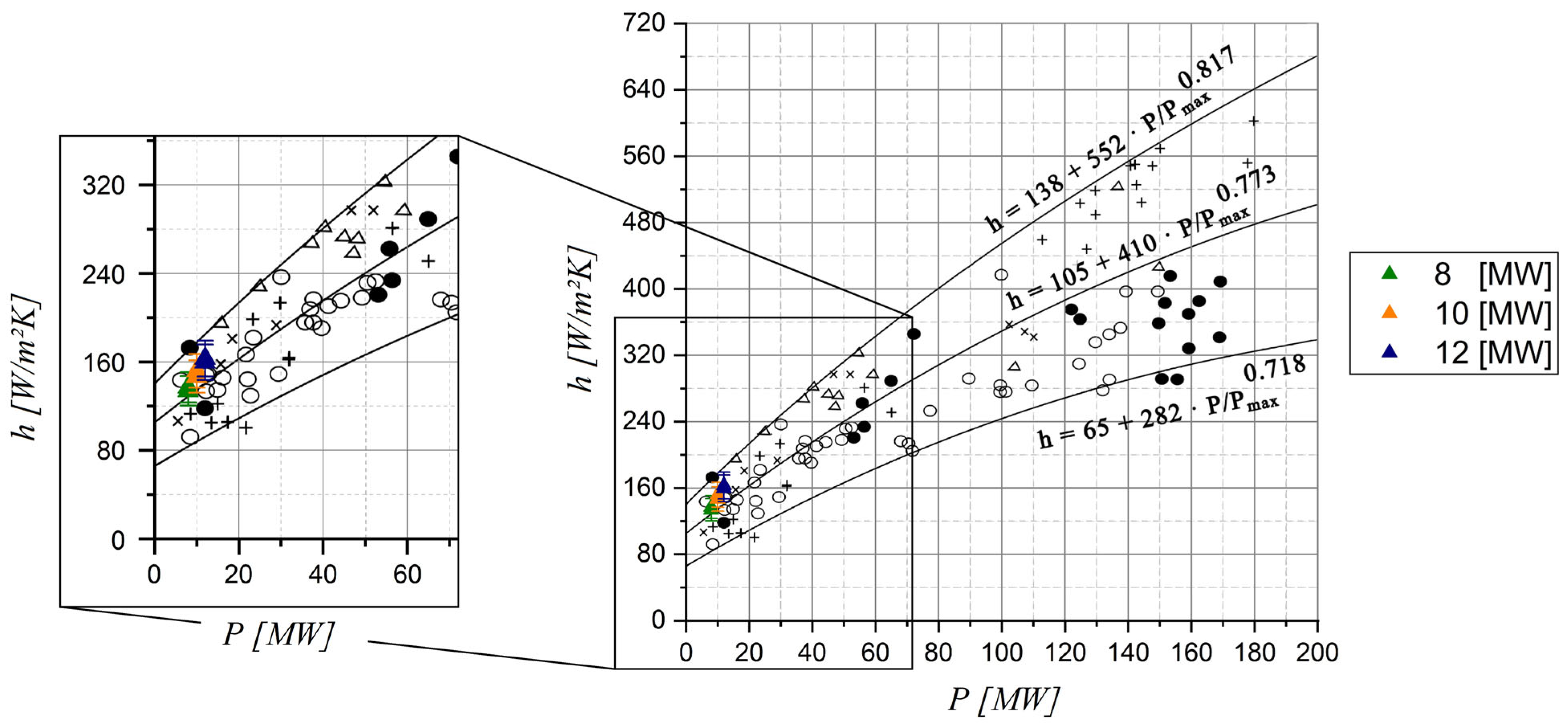 6] performed a thermo-structural analysis during transient operations for a 30 MW steam turbine, which was accompanied by a test campaign on a full-scale test rig. The focus was on modelling and numerical simulation. Therefore, just a few thermocouples on the outer surface of the steam turbine casing were used as initial data. Heat fluxes were not measured. No error bars are provided either.