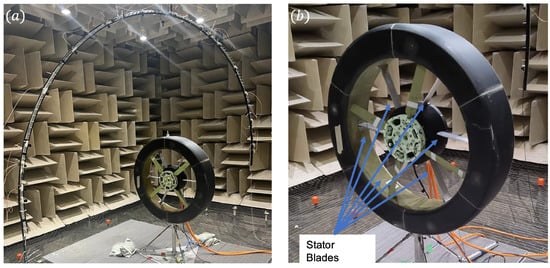 The ducted rotor used in this study is a possible design for future electrically driven helicopter tail rotor systems. The system consists of a four-blade rotor () and a duct held by six stator vanes (). Due to confidentiality, all the following measurements are given based on the diameter of the casing (D). The system has a hub with a diameter of and a tip gap of approximately . The casing extends up to downstream of the center of rotation. The experiment was carried out inside the open-jet anechoic wind tunnel at the Université de Sherbrooke (UdS), which has a cut-off frequency below 100 Hz and wedge-tip to wedge-tip dimensions of 7 m long, 5.5 m wide, and 4 m tall. The ducted rotor is tested in hover in the middle of the anechoic chamber, as shown in Figure 1. Table 1 summarizes the main physical and geometrical parameters.