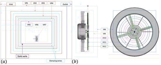 Computational domain and voxel refinement regions: (a) full domain; (b) zoom on the fan.