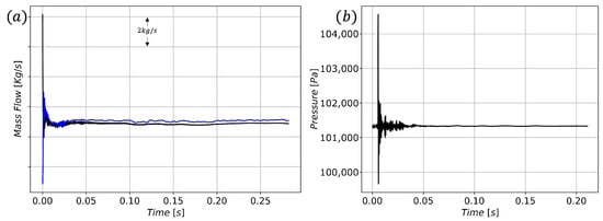The convergence of the aero-acoustic simulation is monitored by the stabilization of the mass flow rate in the two mentioned surfaces and the pressure signal on the far-field probes mimicking the experimental microphones. Figure 3 shows that convergence is achieved for both variables after 0.05 s, corresponding to three rotations. This value is lower than the number of revolutions at which data storage begins, indicating that the transient behavior of the system has been properly removed. Furthermore, the difference between the mass flow rates recorded at the inlet and outlet surfaces, black and blue lines in Figure 3a respectively, is less than 2%, suggesting consistency in the simulation.