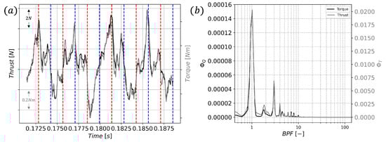Integrated torque and thrust on the rotor blades. (a) Evolution over one rotation; (b) power spectral density.