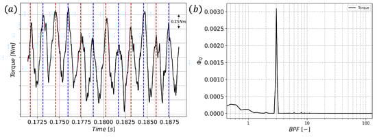 A similar methodology is applied to the integrated torque on the stator vanes in Figure 5. The same convention for the vertical lines is followed. As with the rotor, the displacement between lines is related to an angular displacement of . Figure 5b shows again the appearance of the 3rd harmonic of the BPF as the main contributor based on the number of peaks and blades in the system. In contrast to the rotor, the first harmonic of the BPF is not present, as the data are now recorded in a stationary frame. Additionally, when Figure 5a is analyzed, a time shift is observed relative to the time trace in Figure 4. This shift corresponds to an angular displacement of 23°, which is less than the distance between the two interactions with the stator vanes (30°). Therefore, the torque fluctuations are not related to the potential interaction phenomena but rather to some fluid–solid interaction. Rendon et al. [14] already showed in a similar configuration that the main interaction is between the plunging tip vortex and the stator vanes.