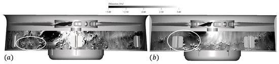 In Figure 7, the instantaneous dilatation field computed as at 95% and 90% span provides a qualitative insight on the acoustic sources involved in the system. The focus is put in the stator region to obtain a better view of the vortex–vortex and fluid–solid interaction. Two different time frames and views are used to show the phenomena of interest. Figure 7a shows the merging point of the tip vortex and vortex sheet surrounded by the white circle. In addition to the hydrodynamic structures, acoustic waves are produced as a consequence of this interaction. Therefore, quadrupolar noise can be present in the far-field noise signature of the present ducted rotor. On the other hand, surrounded by the white circle in Figure 7b, the interaction of the convected tip vortex with one of the stator vanes is seen. Due to this impingement, acoustic waves are emitted from the stator vane. The wave fronts are mostly masked by the presence of the trailing-edge noise source. However, there is a clear difference in the frequency of emission, with the stator source radiating at a lower value. Now that the tip-vortex–stator interaction is confirmed with a possible noise source related to it, the pressure fluctuations on the surface are analyzed.