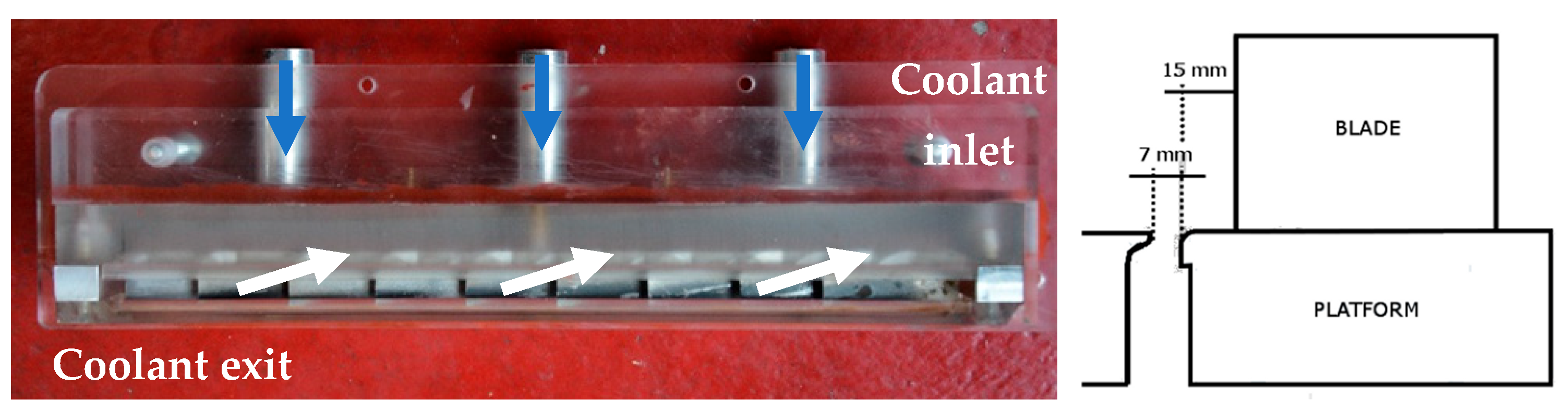 - Barigozzi, G.; Perdichizzi, A.; Pestelli, L.; Abram, R. Combined Experimental and Numerical Investigation of the Aero-Thermal Performance of a Rotor Blade Cascade with Platform Cooling. In Proceedings of the ASME Turbo Expo 2019: Turbomachinery Technical Conference and Exposition, Phoenix, AZ, USA, 17–21 June 2019. Paper No. GT2019-91601. [Google Scholar]