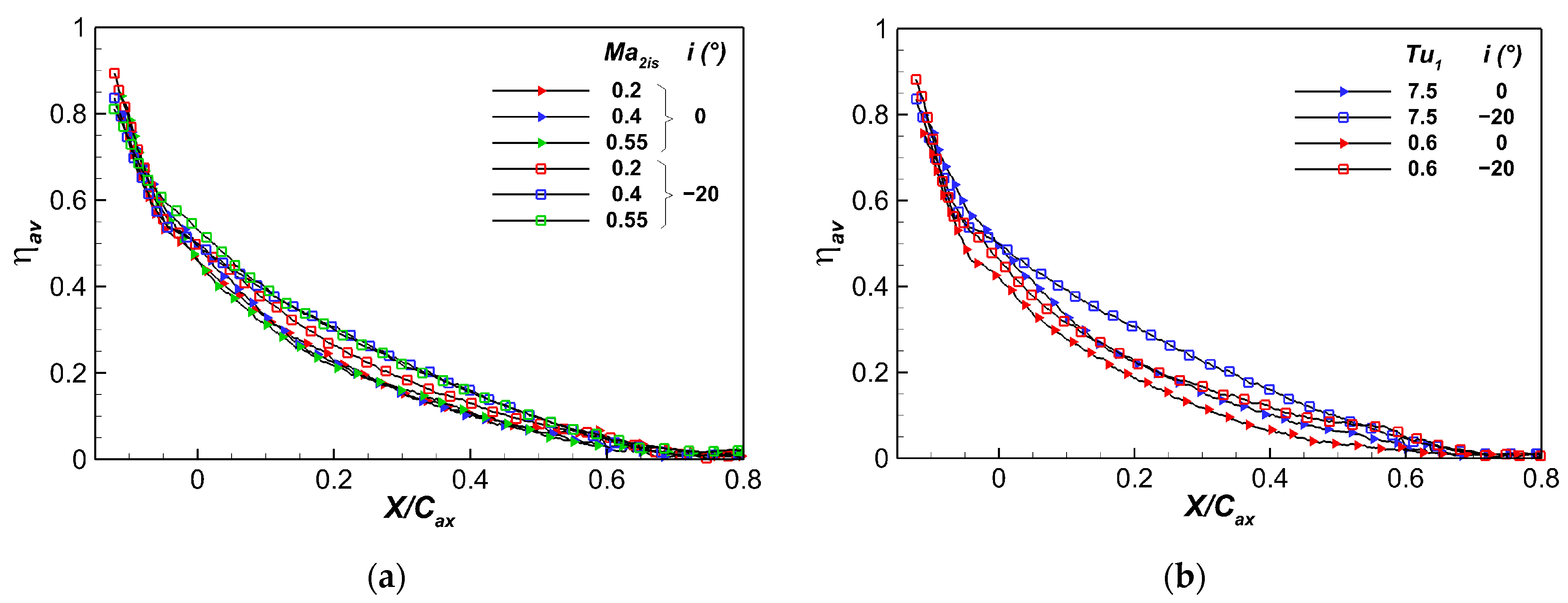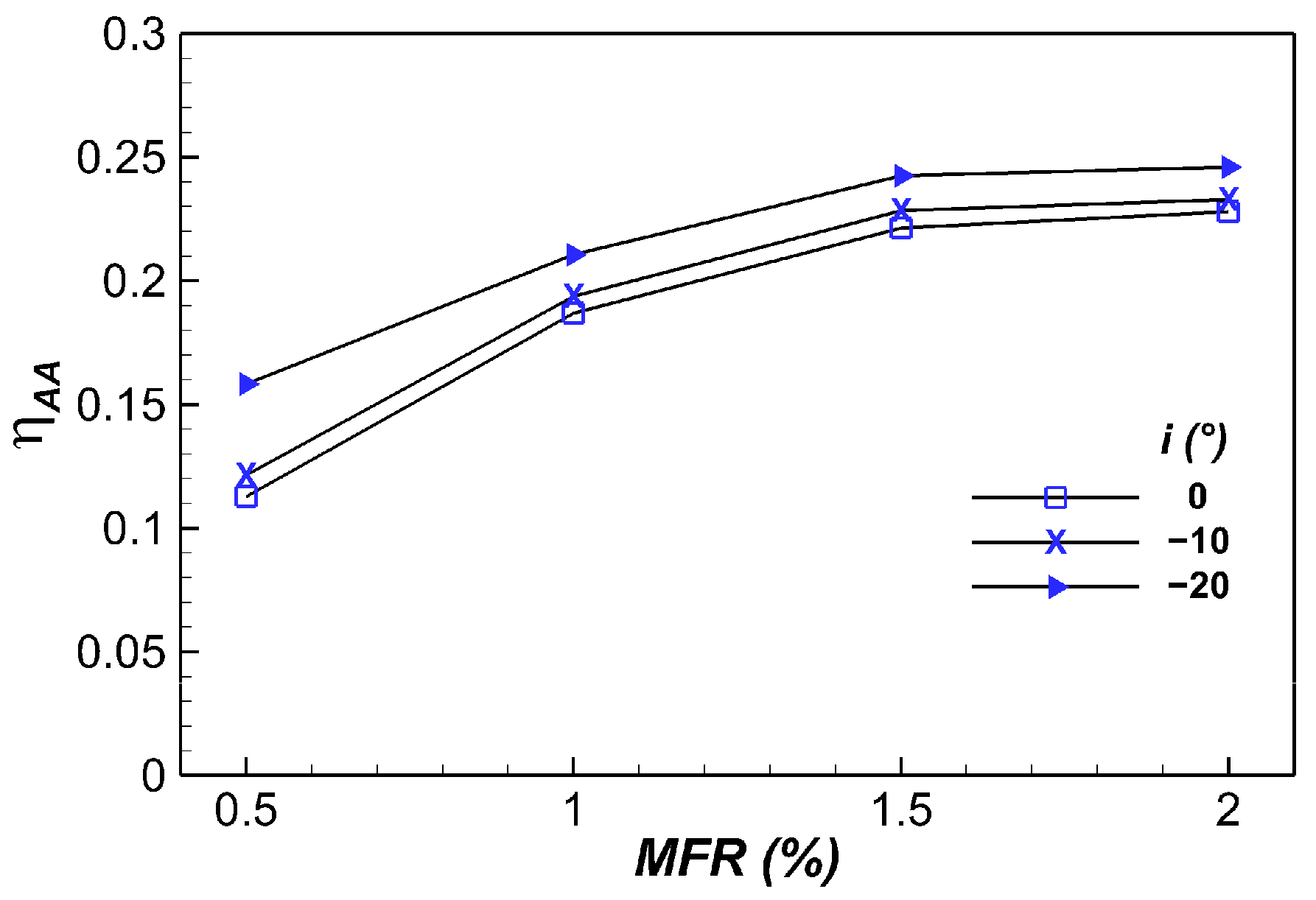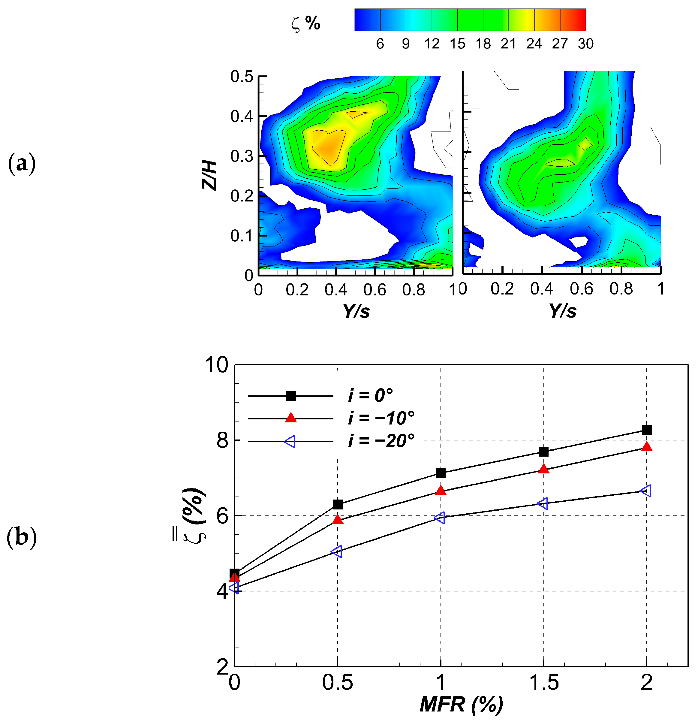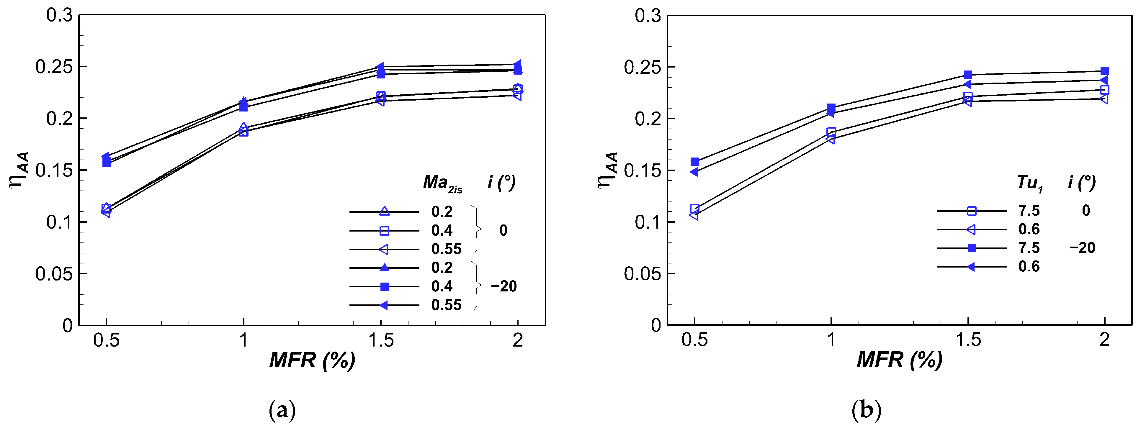 5.2.1. Influence of i and MFR at Ma2is = 0.4 and Tu1 = 7.5%