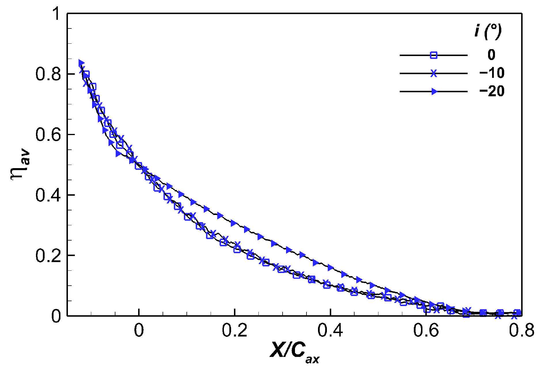 - As expected, since negative incidence reduces secondary-flows generation and development across the cascade, improved film cooling effectiveness distributions are observed at negative incidence, especially at −20°. An incidence reduction of −10° instead only marginally impacts the thermal protection. In all cases, coolant only protects the passage front portion, as it is not allowed to cross the passage vortex-related 3D separation line.