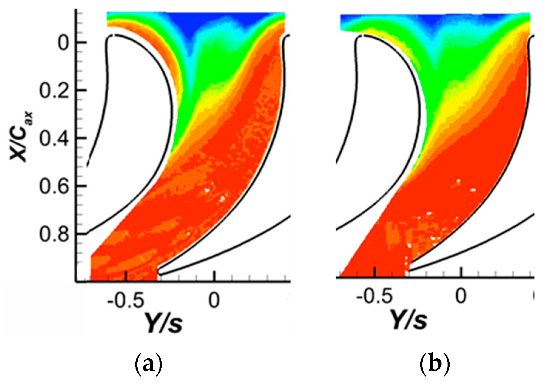 - Perdichizzi, A. Mach Number Effects on Secondary Flow Development Downstream of a Turbine Cascade. J. Turbomach. 1990, 112, 643–651. [Google Scholar] [CrossRef]