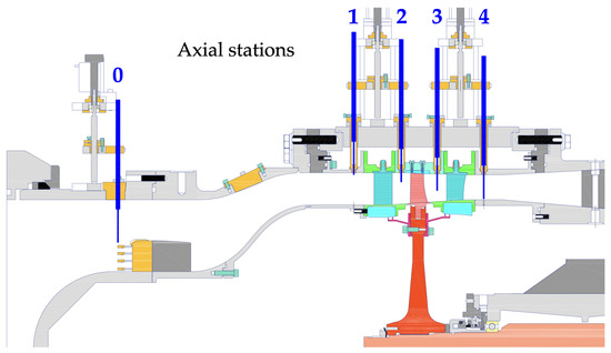 In Figure 1, the axial measurement planes are defined as follows: Plane 0 (stage inlet), Plane 1 (IGV inlet), Plane 2 (IGV outlet/rotor inlet), Plane 3 (rotor outlet/stator inlet), and Plane 4 (stage outlet). The instrumentation employed in this study can be categorized into (a) fixed instrumentation, which includes rakes positioned in Plane 0 and Plane 4 to measure the whole stage performance, static pressure taps for the measurement of wall-averaged static pressures, and fast-response wall casing sensors; and (b) movable instrumentation, consisting of probes that traverse radially across all axial planes and at four azimuthal positions per plane (0°, 90°, 180°, 270°).
