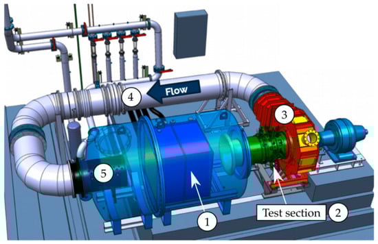 The DREAM compressor stage is installed in the von Karman Institute high-speed compressor test rig R4 (Figure 2). This facility consists of (1) a tank, (2) the compressor test article, (3) a discharge collector, (4) a return duct to drive the air back to the reservoir, and (5) a throttling valve for precise adjustment of the compressor operating point. The rotor is driven by a 700 kW DC motor whose rotational speed can be controlled continuously. The closed-loop configuration allows the pressure adjustment within 0.3 and 3 bars, while the heat exchanger located in the settling chamber regulates the total temperature at the test section inlet with an accuracy of ±1 °C. Such operation of the facility enables an independent variation in Reynolds and Mach numbers to accurately replicate specific aircraft flight conditions, such as cruise (CR) or take-off (TO).
