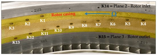 A total of 15 flush-mounted Kulite sensors (K1–K15) are installed on the rotor casing to detect unsteady pressure signals and reconstruct the tip flow in the rotor relative frame of reference. Among these, the K14 and K15 sensors (Figure 3), located axially in Plane 2 and Plane 3, were employed for the present measurement campaign and used to validate the CFD results at the rotor casing (Section 4.3.2).