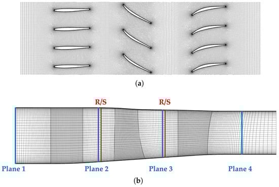 Figure 5 presents the B2B view at 50% of the span (Figure 5a) and the meridional view (Figure 5b) of the mesh (noting that the view in Figure 5a does not extend to the inlet and outlet of the domain to enhance the visibility of the grid resolution).