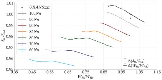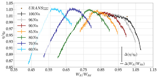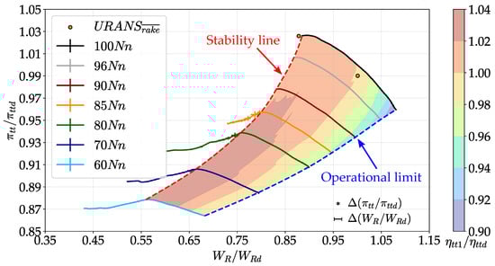 Figure 6, Figure 7 and Figure 8 present the total-to-total pressure ratio (), isentropic efficiency (), and total-to-total temperature ratio (), normalized with respect to the DE condition. The figures include both experimental data and performance resulting from time-averaged URANS simulations. Additionally, the pressure ratio (Figure 6) is complemented by the efficiency contour map. The instrumentation uncertainty, calculated within 95% confidence interval, is also reported.