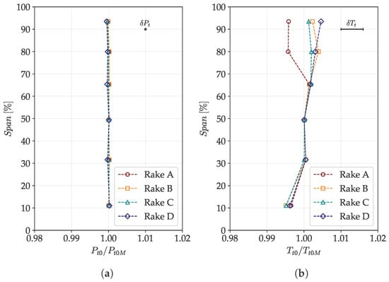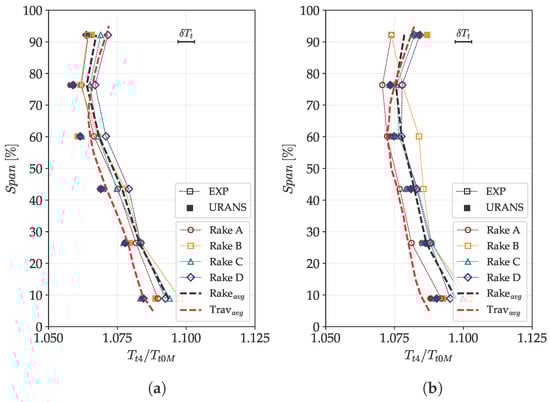 Total temperature span-wise distributions retrieved at the stage outlet (Plane 4): (a) DE condition; (b) NS condition.