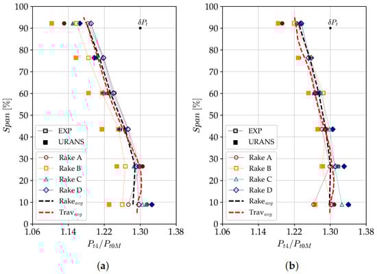 Total pressure span-wise distributions retrieved at the stage outlet (Plane 4): (a) DE condition; (b) NS condition.