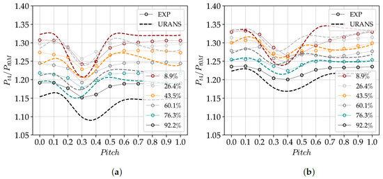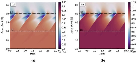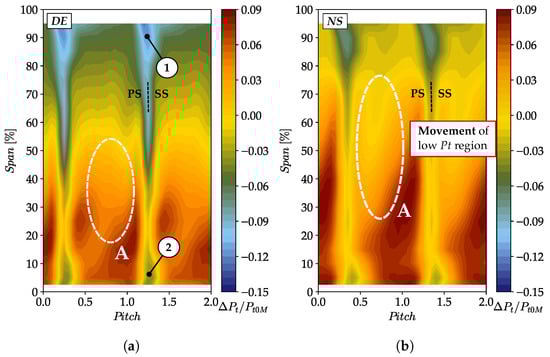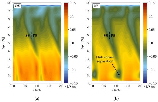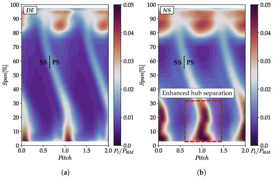 Figure 10 also highlights that, particularly at DE condition, the simulations predict lower total pressure compared to the experimental results, especially at the location of Rake B (Figure 10a). The source of this discrepancy can be identified in Figure 12, where the pitch-wise outlet total pressure at DE and NS conditions is presented. The legend indicates the span-wise location of the corresponding Kiel head.