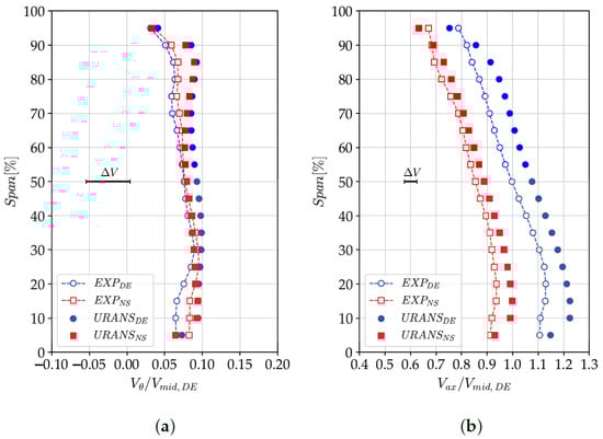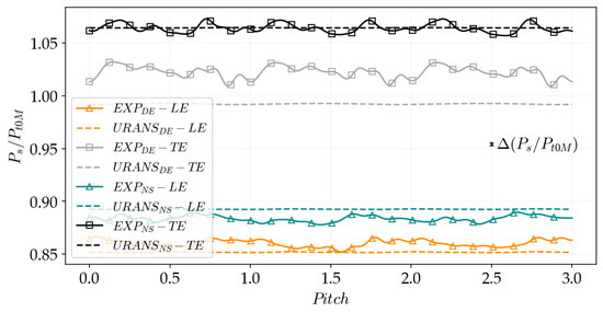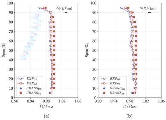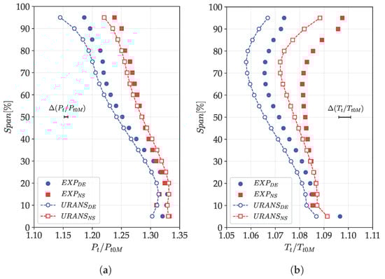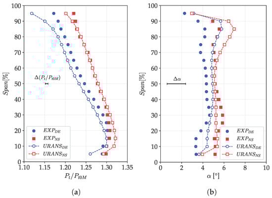 Figure 13 presents the pitch-wise averaged total pressure in Planes 1 and 2 at DE and NS conditions. The experimental uncertainty is also reported. Moreover, it is important to recall that the simulations do not account for the stage inlet duct. Instead, the inlet boundary conditions are applied at the location of experimental Plane 1.